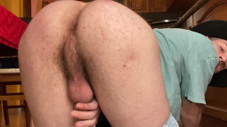 dark-haired guy shows his ass and cock in the kitchen after smoking.