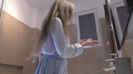 Hot Skinny Long Hair Blonde Wife has a new Blue Super Short Miniskirt and under it she has white cot