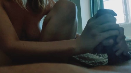 My big boobs step cousin gives me a handjob. Love touching my tick cock and makes me cum hard
