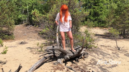 redhead milf pissing in the woods standing on a log 4K 60fps