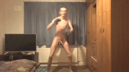 Skinny twink in boxing gloves does shadow boxing and shows off his ribs